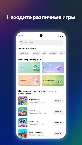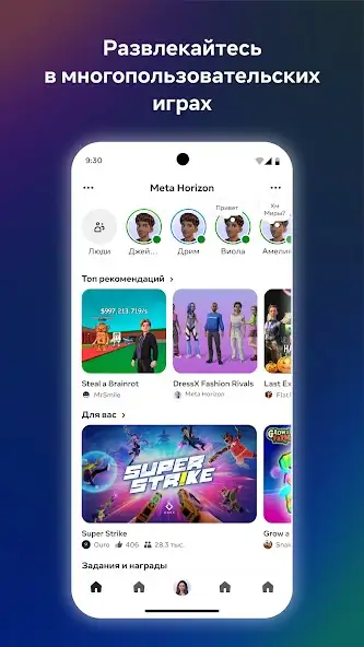 Meta Horizon — каталог видеоигр с функцией сообщества для запуска игрового процесса. Присутствует выбор из различных жанров, например приключений, экшенов, стратегий или головоломок. Доступны уведомления, поисковая строка, персональные, популярные и иные подборки. Имеется реклама и внутриигровые покупки.