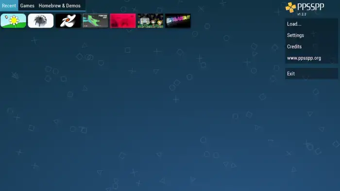 PPSSPP Gold — эмулятор, запускающий контент для Sony PlayStation Portable. Присутствует всплывающее меню с пунктами: «Открыть», «Авторы», «Настройки». Есть интерфейс на русском языке, информация о разработчиках, статусе установки. Доступна навигация по вкладкам: «Недавние», «Игры», с пользовательскими разработками и демоверсиями.