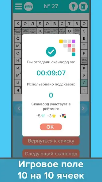 Сканворды — сборник головоломок об отгадывании слов и вписывании их в соответствующие клетки на поле 10 × 10 ячеек. Работает в офлайн-режиме. Можно использовать подсказки без ограничений, собирать коллекции предметов, открывать пейзажи за заработанные звезды, переключаться между полноэкранной и уменьшенной клавиатурами. Позволяет устанавливать фото и имя профиля, делиться приложением через Сеть. Имеется обратная связь с разработчиками. Есть реклама и русскоязычный интерфейс.