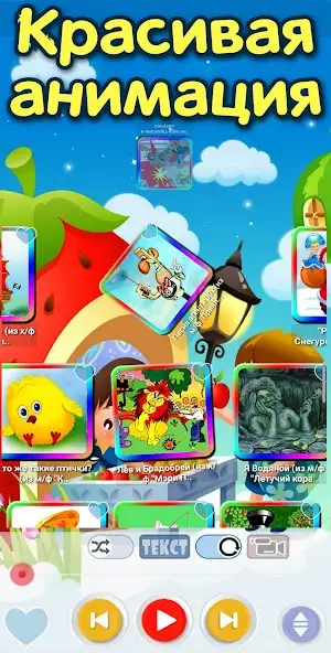 «Детские песни» — каталог с музыкальными произведениями для детей. Содержит композиции из мультсериалов и фильмов, праздничные, колыбельные, прочие. Понравившиеся варианты разрешается добавлять в список избранных. Есть караоке и фоновое воспроизведение. Может работать без подключения к Сети.
