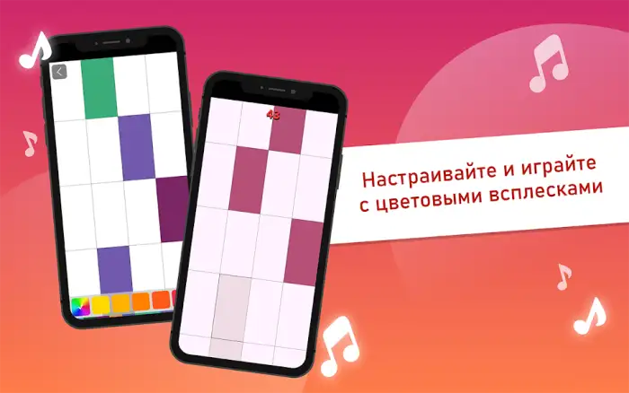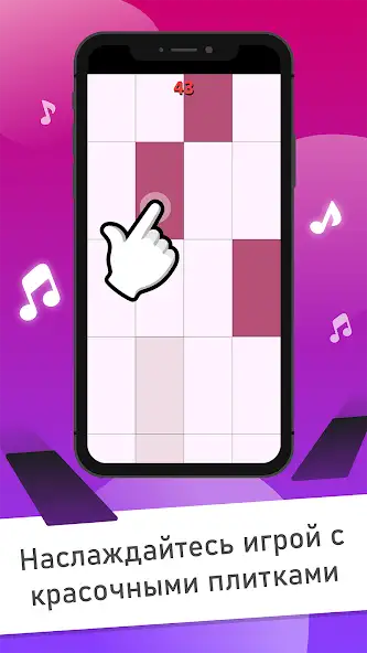 Piano Tiles — однопользовательская казуальная аркада о нажатии кнопок фортепиано. Необходимо нажимать на черные плитки, не прикасаясь к белым. Присутствует библиотека мелодий и более 35 игровых режимов. Предстоит разблокировать музыкальные композиции. Можно слушать песни, создавать плейлист, делиться контентом через Сеть, играть офлайн, выполнять задания и соревноваться за место в рейтинговой таблице. Имеется выбор тем, цветов клавиш. На экране отображаются набранные очки.