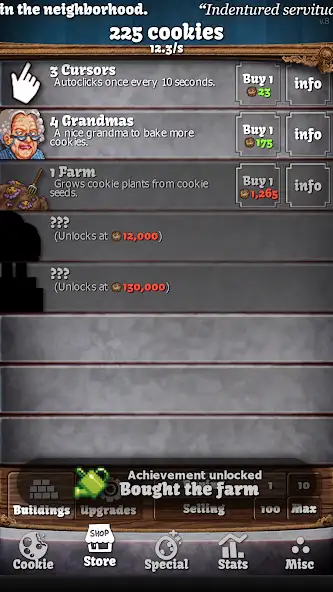 Cookie Clicker — кликер с элементами симулятора о необходимости нажимать на гигантское печенье, чтобы получать выпечку, зарабатывать, развиваться, управлять Вселенной. Приобретение старушек повышает количество производимых кондитерских изделий. Доступно разблокирование достижений, улучшений, например: молотка, курсора, лейки. Можно настраивать пекарню, приобретать приспособления для изготовления печенья без участия игрока, к примеру, когда устройство выключено.