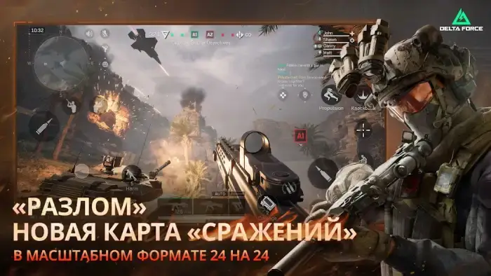 Delta Force — тактический шутер от первого лица про войну с противниками. Предстоит проходить миссии, управлять наземной, воздушной, морской техникой, командовать танком, наносить ракетные удары. Присутствует 6 уникальных режимов, таких как «Операции», где придется объединяться с командой, вступать в бой против ИИ-наемников или других отрядов игроков. Доступен выбор из более 100 видов оружия: автоматов, пулеметов, пистолетов, прочего. Имеется 9 карт сражений, например «Разлом» в формате боя 24 на 24.